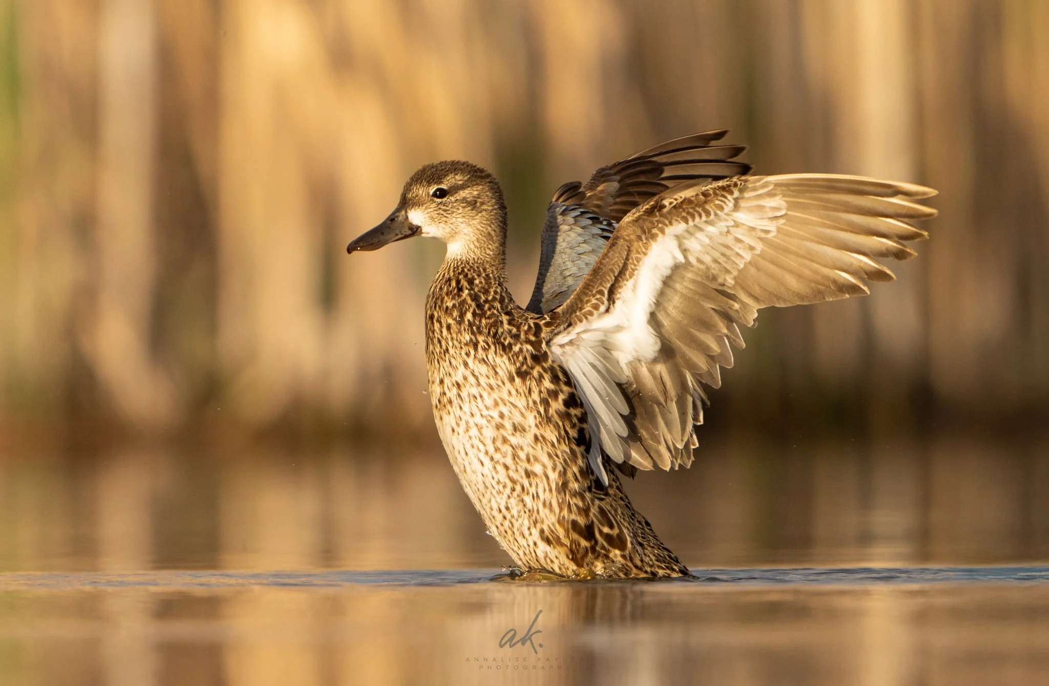 A hen blue-winged teal (Spatula discors) stretches her wings before resettling in the water. Overlooked by many because of their drab colors designed around camouflage, a close look reveals their subtle blue patch on their wings.